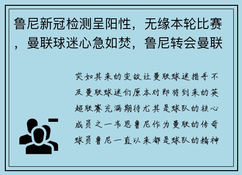 曼联球迷们原本对即将到来的英超联赛充满期待,尤其是球队的核心成员之一——韦恩·鲁尼。作为曼联的传奇球员,鲁尼一直以来都是球队的精神象征。无论是作为一名球员还是球队的主教练,他都以极高的职业素养和卓越的领导能力赢得了球迷们的尊重和爱戴。因此,当球迷们得知鲁尼因新冠检测呈阳性而无缘本轮比赛的消息时,不禁感到措手不及。