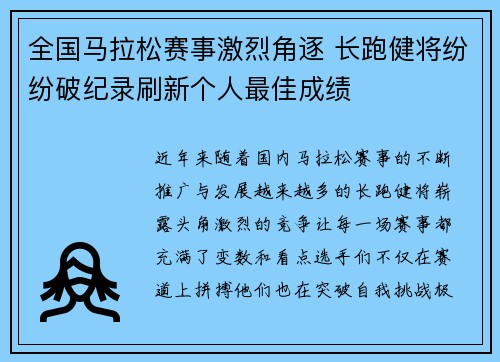 近年来,随着国内马拉松赛事的不断推广与发展,越来越多的长跑健将崭露头角,激烈的竞争让每一场赛事都充满了变数和看点。选手们不仅在赛道上拼搏,他们也在突破自我,挑战极限,刷新了一个又一个个人最佳成绩,甚至打破了全国性赛事纪录。这些变化反映出国内马拉松赛事的快速发展与长跑文化的普及,吸引了更多的跑者参与其中,不仅提高了竞技水平,也极大地提升了赛事的观赏性和影响力。本文将从以下四个方面探讨全国马拉松赛事中的激烈角逐及选手们如何在赛道上不断挑战自我、刷新个人纪录,展现出他们顽强的精神与不断进步的动力。