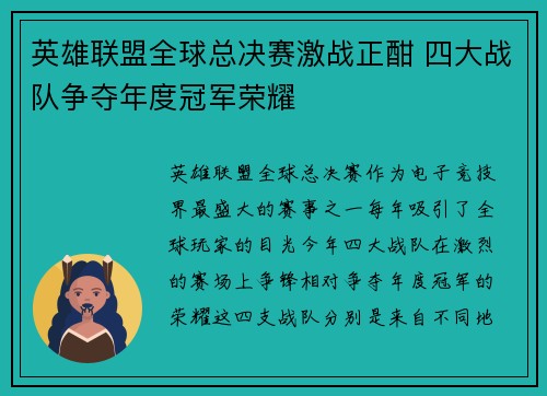 《英雄联盟全球总决赛》作为电子竞技界最盛大的赛事之一,每年吸引了全球玩家的目光。今年,四大战队在激烈的赛场上争锋相对,争夺年度冠军的荣耀。这四支战队,分别是来自不同地区的顶尖队伍,他们经过长时间的备战和无数场对抗,终于在决赛舞台上展开了最后的较量。这篇文章将从四个方面对这一激烈的战斗进行详细分析,包括战队阵容的实力对比、关键战术的变化、赛场内外的心理博弈以及全球观众的热情支持。每个方面将从多个角度阐述,为读者呈现一场精彩纷呈的电竞盛宴。