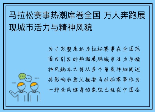 为了完整表达马拉松赛事在全国范围内引发的热潮,展现城市活力与精神风貌,本文将从多个角度详细阐述其影响和意义。